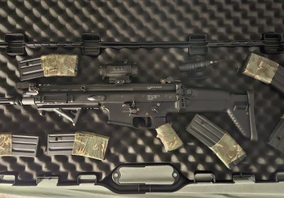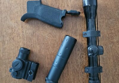 bij het wapen, zit een opbergtas, 5 midcap magazijnen, een silencer en een lamp van het merk oblight die je